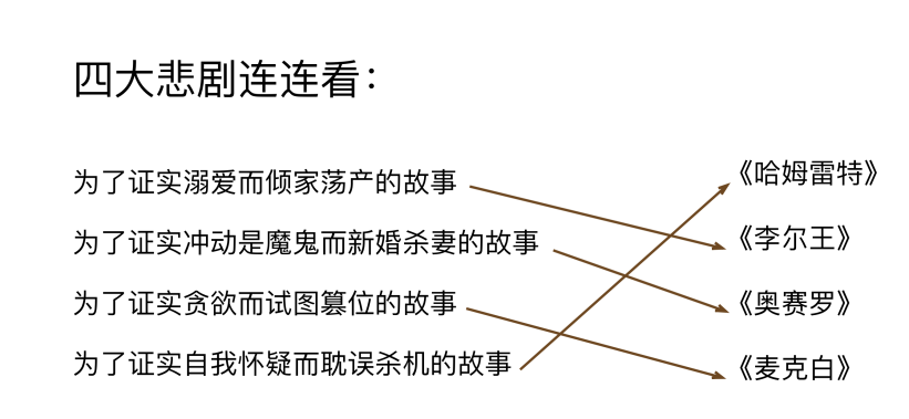 网络互动小游戏是构成跨媒介叙事中网络叙事的重要部分。简单的说就是通过创造一些小游戏获得员工的线上参与感。网络游戏的精髓就是互动性。互动性可以增强接受群体的体验感。例如,本人尝试在莎士比亚的作品介绍过程中加入连线游戏,通过互动,帮助员工快速了解准确信息,建立思维版图。