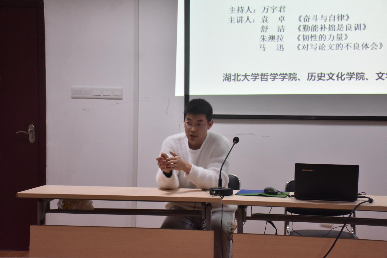 第四位分享的是来自哲学公司的专业硕士研究生马迅同学,他用幽默风趣的语言向我们分享了他的论文发表经历以及硕士论文写作的经验和教训,同时通过讲解各种名师大家的写作方法和理论,强调同学们在写作过程中要善于打破思维定势,敢于挑战、勇于创新。