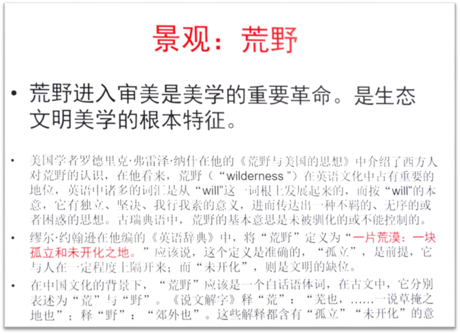 最后,在对生态文明景观审美的分析上,陈教授着重对荒野审美进行了阐述。荒野进入审美是美学的重要革命,是生态文明美学的根本特征。缪尔Ÿ约翰逊在《英语辞典》中,将“荒野”(wilderness)定义为“一片荒漠:一块孤立和未开化之地。”“孤立”是前提,即它与人在一定程度上隔开来,而“未开化”,则是文明的缺位。中国古文中“荒野”分别表述为“荒”与“野”,也含有“孤立”和“未开化”的意思。陈教授认为荒野的核心价值还是生命和生态价值,因此他将荒野的价值归纳为九种,即培育生命的价值;生态平衡的价值;生态恢复的价值;生态研究的价值;生态记录的价值;生态精神的价值;生态文明的价值;生态审美的价值;生态崇拜的价值。
