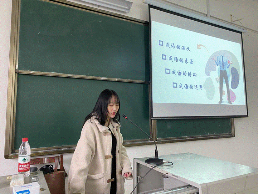 在这期格致学堂的开始,学姐们分别询问了大家对于成语的理解,对成语的特点做了阐释。学姐们通过引经据典,向同学们讲述了成语具有四大特点,它们分别是:结构的凝固性,意义的整体性,使用的沿袭性和风格的典雅性。