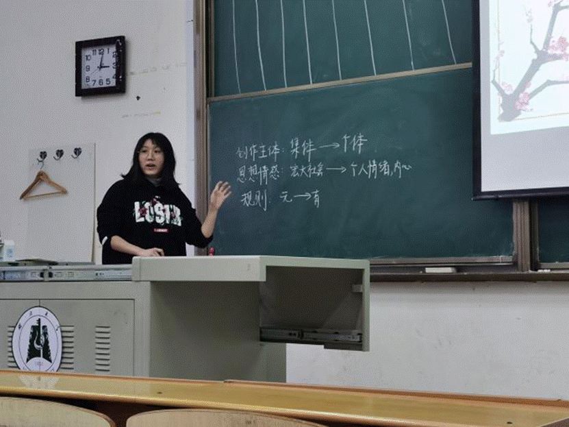 此次授课主要分为三个部分,集中讲解,分块讲解,分组展示。在集中讲解部分,主讲人们根据自身感受讲述了“何为诗词,何为吟诵”,并播放了古诗朗诵视频,让同学们切身感受“何为古诗吟诵”。在分块讲解部分,主讲人们选择用方言版的吟诵让同学们感受吟诵的特点并让同学们标出古诗词的平仄,白秋华,湛宁找了多个方言地区的同学来吟诵古诗,成功带动了课堂氛围;杨丽文还将古诗词吟诵和音乐联系起来,吴莎着重讲了吟诵的方法。在最后的分组展示阶段,每个小组都利用刚刚学习到的知识进行了古诗吟诵,主讲人们一一点评。