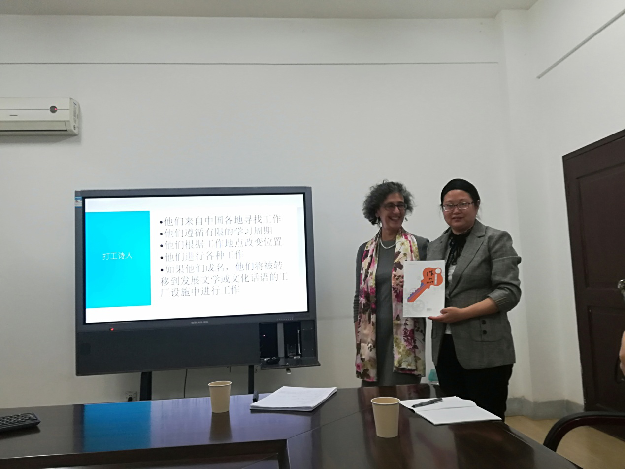讲座伊始,朱西女士结合自己自1980年代以来体验到的四十多年来中国社会的巨大变化,引导我们进入打工诗歌所反映的世界。接着,她结合自己为《作品》杂志所作的24位打工诗人诗歌的翻译,对郑小琼、许立志等打工诗人的诗歌文本进行了解读,对中国打工诗歌的语言特质、意象表达、思想主题等作出了独特的阐释和有效的归纳,为我们清晰地呈现出了当代中国社会转型背景下打工诗歌、打工诗人所具有的社会现实品格和所体现的底层文化关怀。