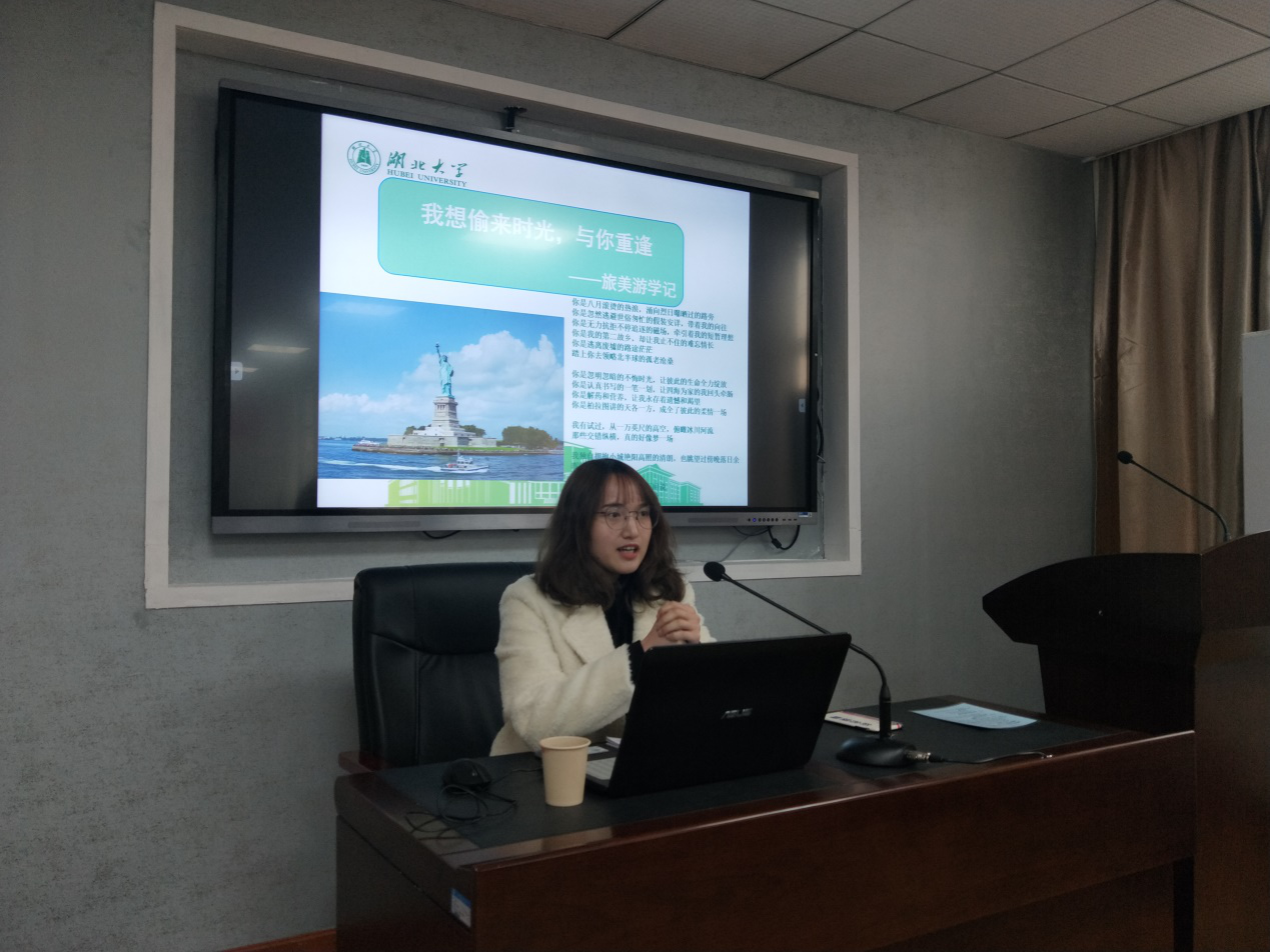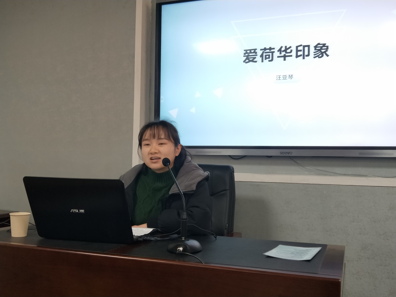 在主持人周芯宇同学的简要介绍后,汪亚琴以“爱荷华印象”为主题向大家展示了在美国爱荷华大学做访学的经历。首先,她向大家传授了海外游学的行前准备,传授了面试、签证方面的经验。然后,汪亚琴同学主要展示了在爱荷华期间的所见所闻、风土人情,从爱荷华大学访学、与聂华苓女士的交流与交往、国际写作计划、文化考察这四个部分向同学们展开介绍,用丰富的照片带领大家领略美国的山川湖海、民俗文化。汪亚琴在读博阶段致力于研究聂华苓及其作品,在美期间也做了许多有关聂华苓女士的访学工作,在此次分享会中也向同学们展示了先生家中的文化氛围、字画信件等珍贵的影像照片。最后,汪亚琴同学对爱荷华访学做出了总结,她比较了中美差异,并进一步认为美国在环保、文化专注度、基础建设等方面是非常值得我们学习的。