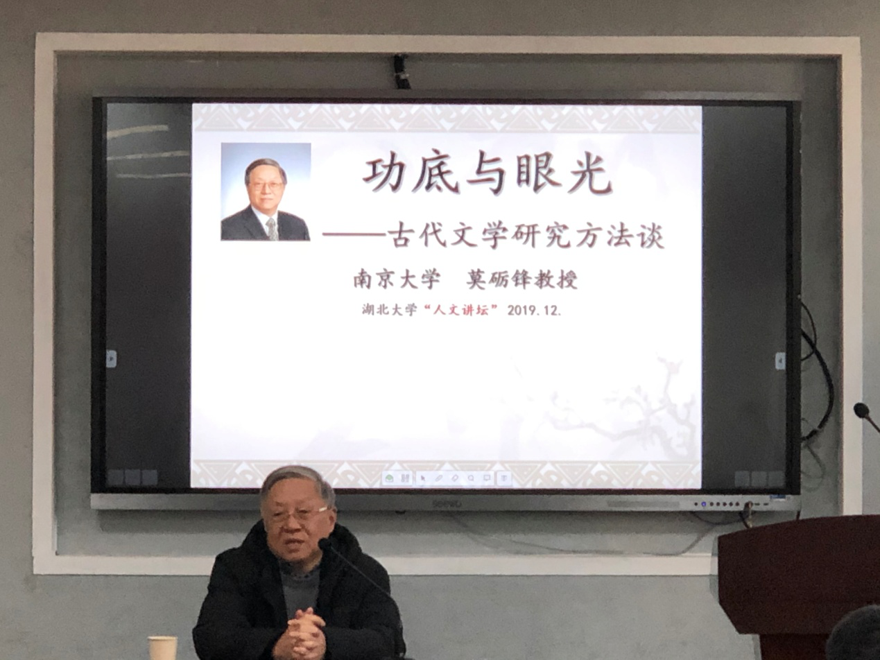 2019年12月27日下午,人文讲坛第333期在威廉希尔官网B6016会议室顺利举行。南京大学人文社会科学资深教授莫砺锋受邀作了题为《功底与眼光--古代文学研究方法谈》的精彩讲座。本次讲座由何新文教授主持,威廉希尔官网部分教师、本科生、古代文学专业的硕士研究生共同参与。同时,外国语公司部分教师旁听了此次讲座。