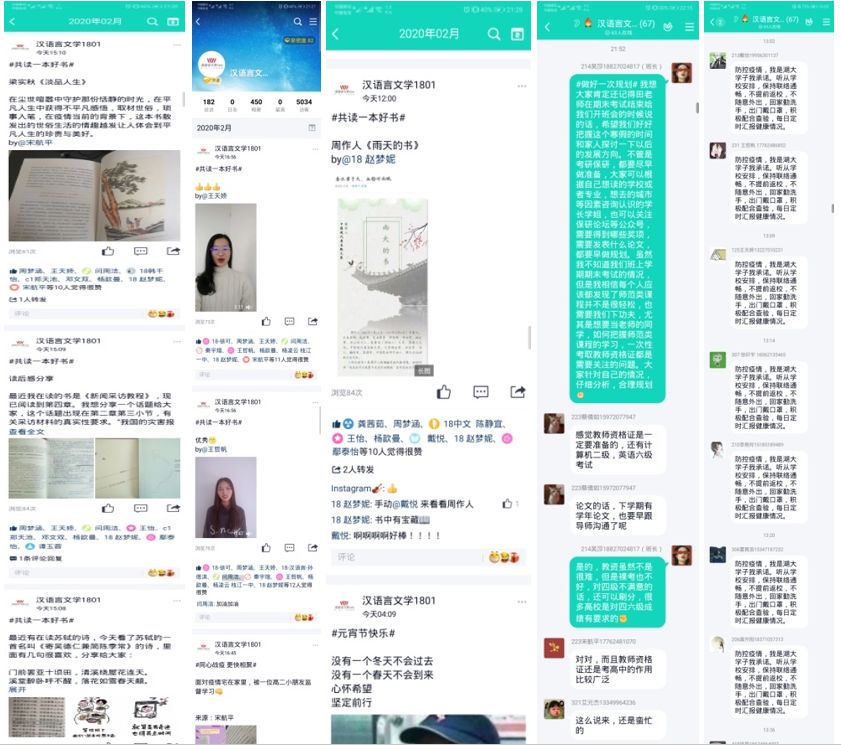 汉语言文学1801网络主题班会围绕校方四个要求展开,全班同学集思广益,拍视频,做手账,晒读书笔记,晒打卡,均通过班Q平台展示,多数同学聚焦最近发生的疫情,线上读书打卡例如加缪的《鼠疫》《霍乱时期的爱情》等书籍。公开承诺环节由班干部带头宣誓,大家接龙回复“防控疫情,我是湖大学子我承诺”等内容,保证不落一人。在做好一次规划环节,班长吴莎针对该班师范方向的特点,对已开设和即将开设的师范课程做出设想,鼓励每位同学积极参与课堂环节,练好师范技能,争取做到“停课不停学”。