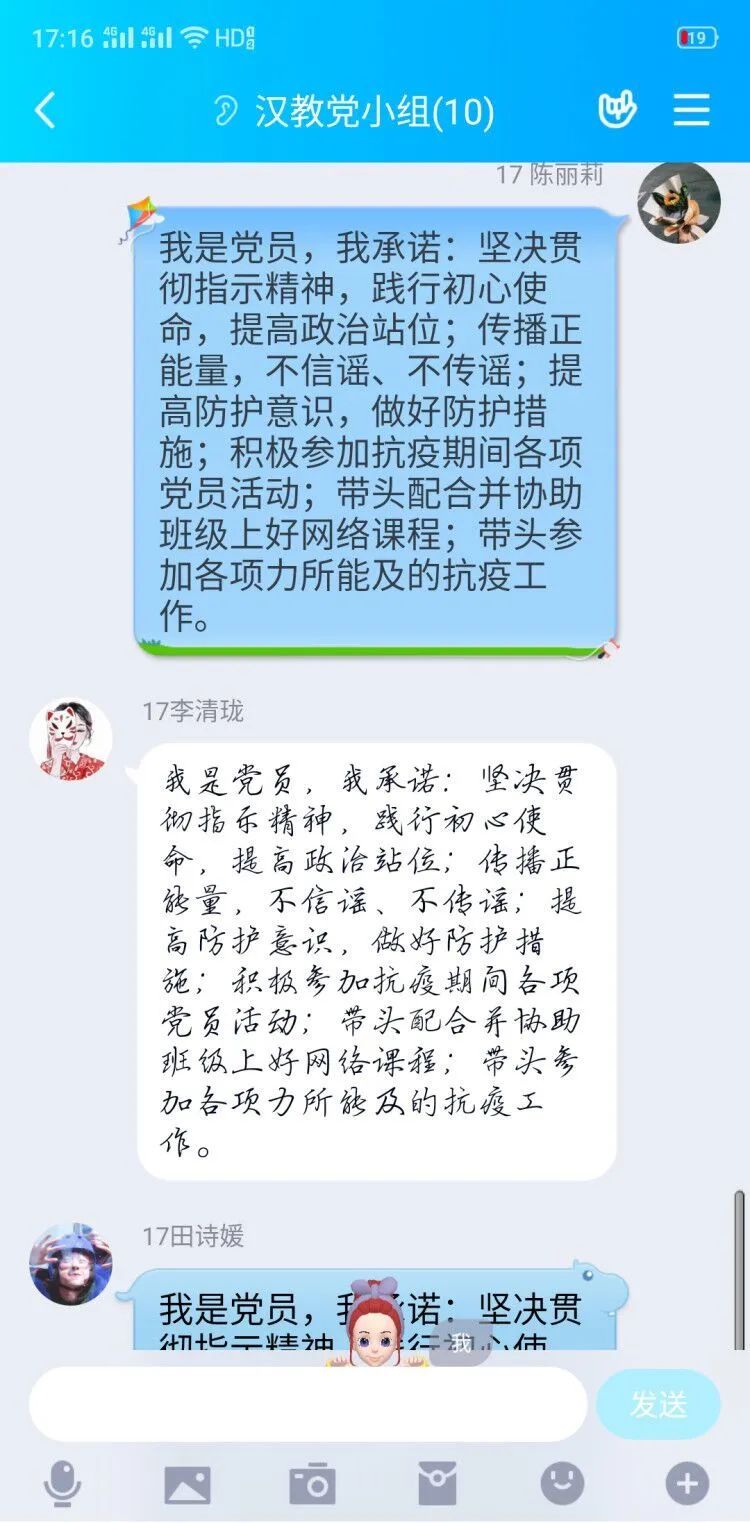 活动开始,全体起立奏唱国歌。由支部书记孙芊领学习近平总书记关于疫情防控工作的重要讲话精神,全体成员积极配合,并结合自己在疫情期间的所思所想进行发言。特别是湖北襄阳的余凝颖同学投身到社区的防疫工作中,切有体会,其他同学也纷纷发表了自己的看法和感慨。在全体成员积极发言讨论后,由支部书记孙芊带领大家重温入党誓词,镜头前,同学们握紧右拳,庄重宣誓,时刻牢记自己是党员的义务与责任。并在群内接龙承诺“我是党员,我承诺。”