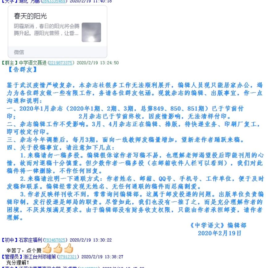 支部宣传委员李晓老师积极同公司社科处沟通,协调解决老师们在国家社科基金和省社科奖提交材料过程中遇到的困难,确保老师们顺利完成各项申报工作;同时发布信息提醒老师们网络钓鱼攻击。支部成员云丹老师由于被困于老家,只好借来电脑,用手机加电脑网上办公,经过开学前的两个多星期的准备,确定了公司一百多门次的理论课程网上授课方式并完成了汇总统计,确保全体员工按时完成了公共必修课和专选课的选课工作。支部成员王双双老师于网上开学前半个月就开始采集研究生新学期授课信息,对于没有条件运用雨课堂进行网络课堂教学的专业课程,和导师一起商讨网络授课的可行办法,同时及时就研究生复试工作和毕业生答辩工作给予家长和员工耐心解答。支部成员、《中学语文》杂志编辑聂进老师,在读者群中介绍疫情期间杂志的编辑出版情况,积极在网上组稿审稿。