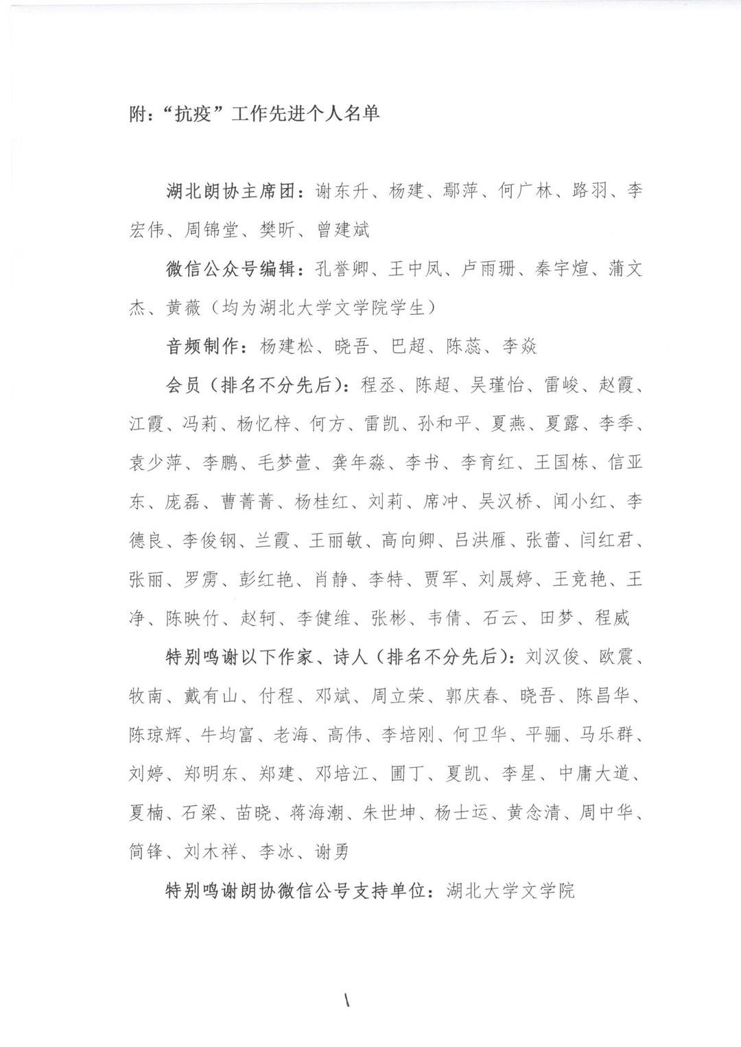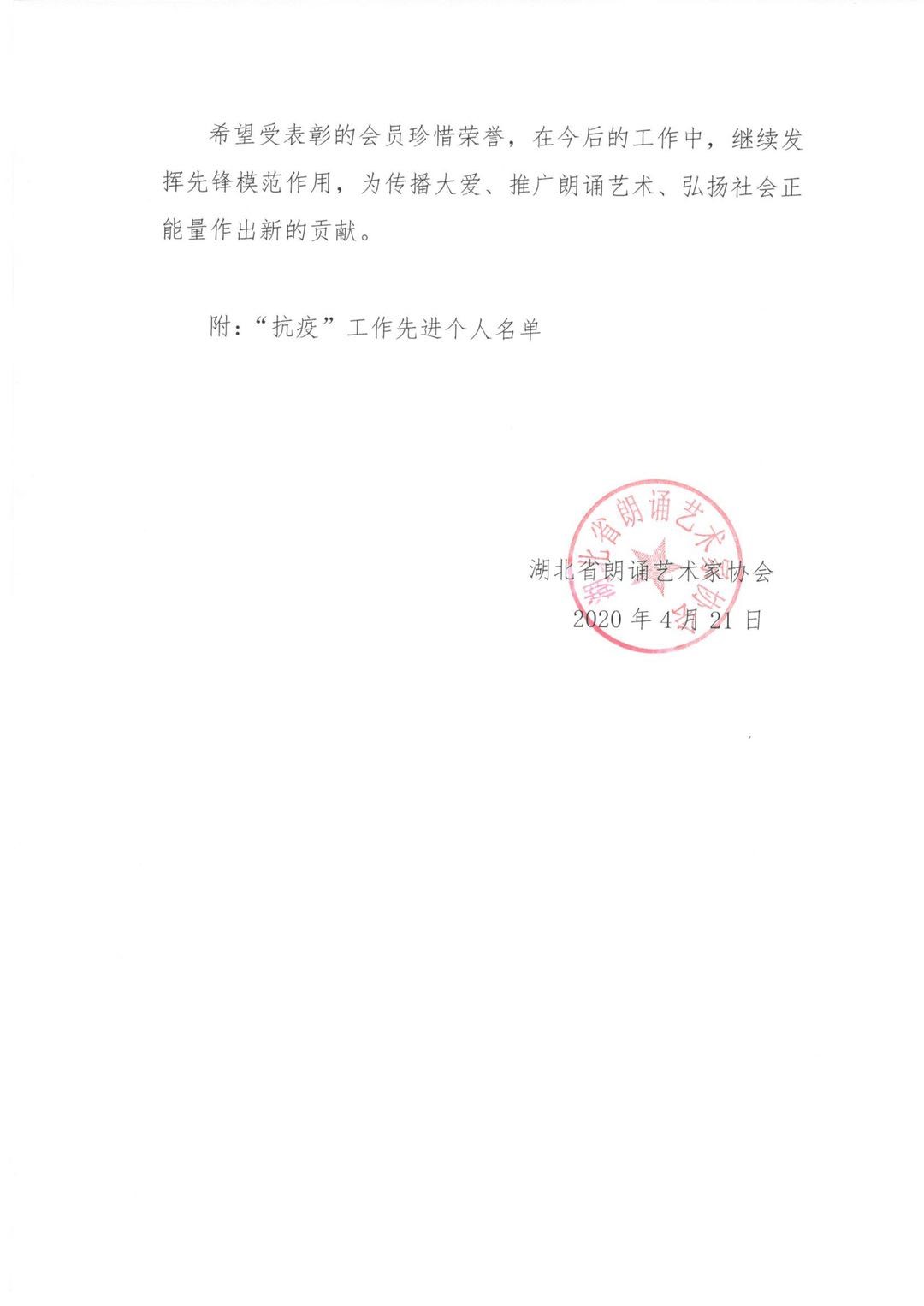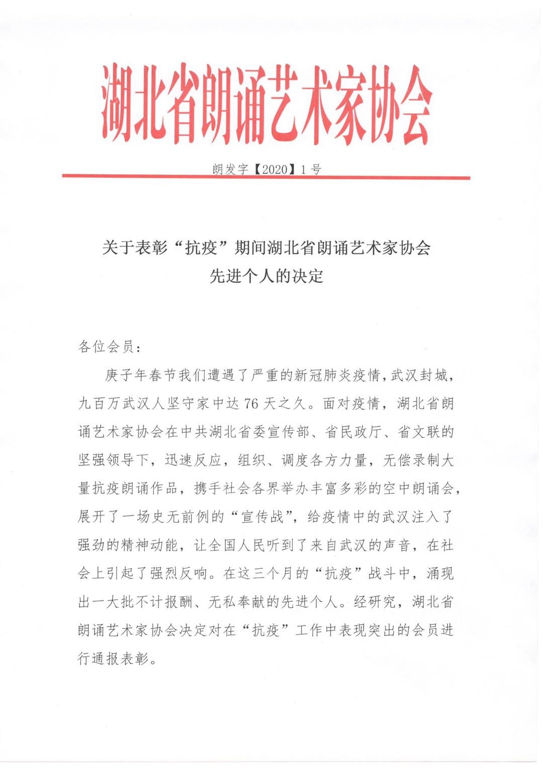 为武汉注入精神动能,让全国倾听武汉声音。4月21日,湖北省朗诵艺术家协会发布《关于表彰“抗疫”期间先进个人的决定》,特别鸣谢威廉希尔,公司2018级编辑出版班蒲文杰等六名员工因在疫情期间参加运营省朗诵艺术家协会公众号的公益服务,获得该协会颁发的“抗疫”工作先进个人荣誉。