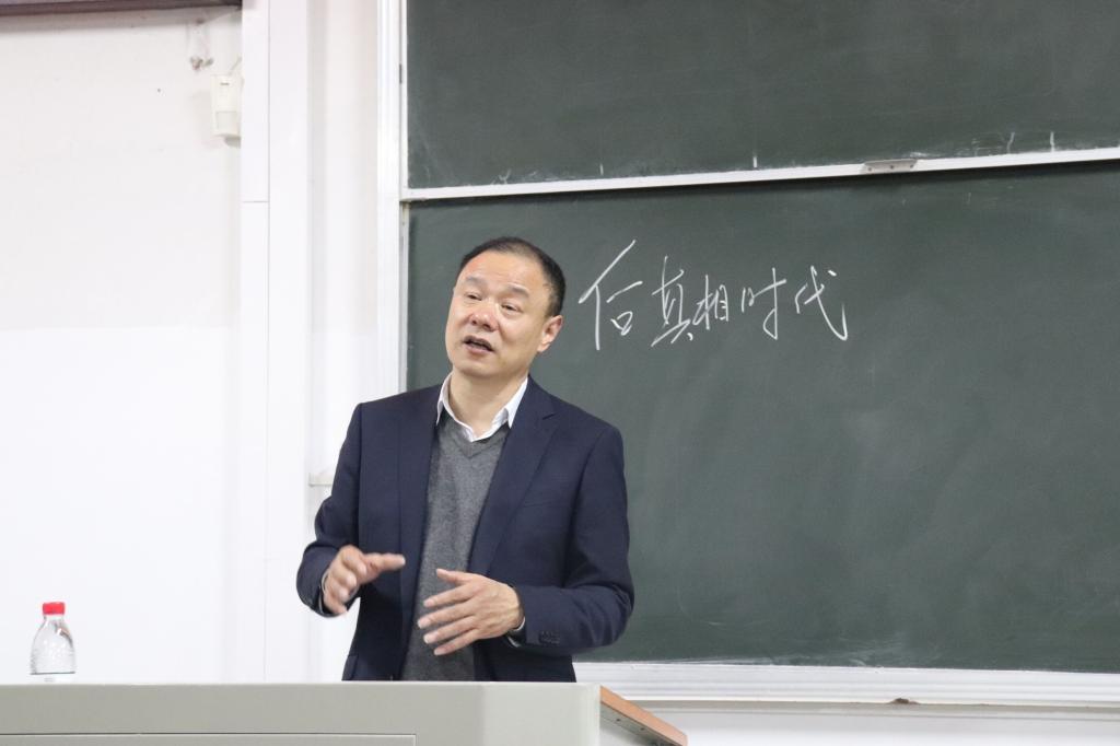 曹军庆老师首先谈到文学在当代发展的困境,指出现代是一个后真相时代,文学在现实面前无计可施,文学发展的问题就是现实大于文学的问题。他提出,文学回应这个时代最重要、最基础、最根本的途径是虚构。并通过神话故事女娲补天,梁山伯与祝英台,白蛇传等古代文学,分析新闻和文学最显著的区别就在于文学比新闻更关注人的内心,由此得出文学必须以虚构的力量表达文学的真实的结论,而这也是虚构的意义。