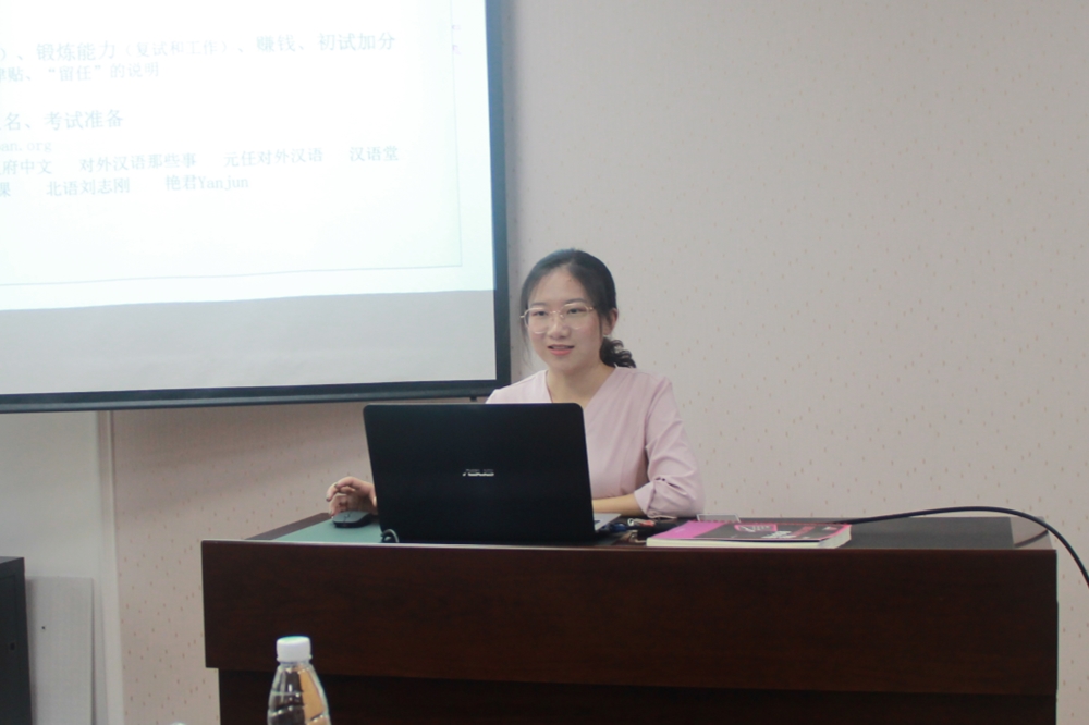 陈翕贤、晏嘉欣分享了她们被保送至北京外国语大学与北京师范大学的经验,陈翕贤鼓励大家利用大学的时间参加与汉教专业有关的比赛,如中学西渐杯、汉教群英会等,并通过参加与汉教有关的专题讲座等不断提升自己,晏嘉欣则系统的讲述了保研的推免过程。