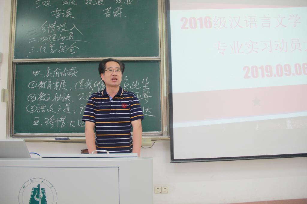 为确保2016级毕业生的实习工作顺利进行,引导员工端正态度,做好实习前的各项准备工作,推进实习工作的顺利开展,公司于9月6日在4-607教室召开了“2016级汉语言文学(师范)专业实习动员大会”。出席动员会的有公司党委书记万明明,经理刘川鄂,副经理刘继林,实习小组指导老师余迎胜、池周平、邹福清,班主任老师田务民、邓辉。实习动员大会由副经理邱庆山主持,2016级汉语言文学(师范)专业同学全部参加。